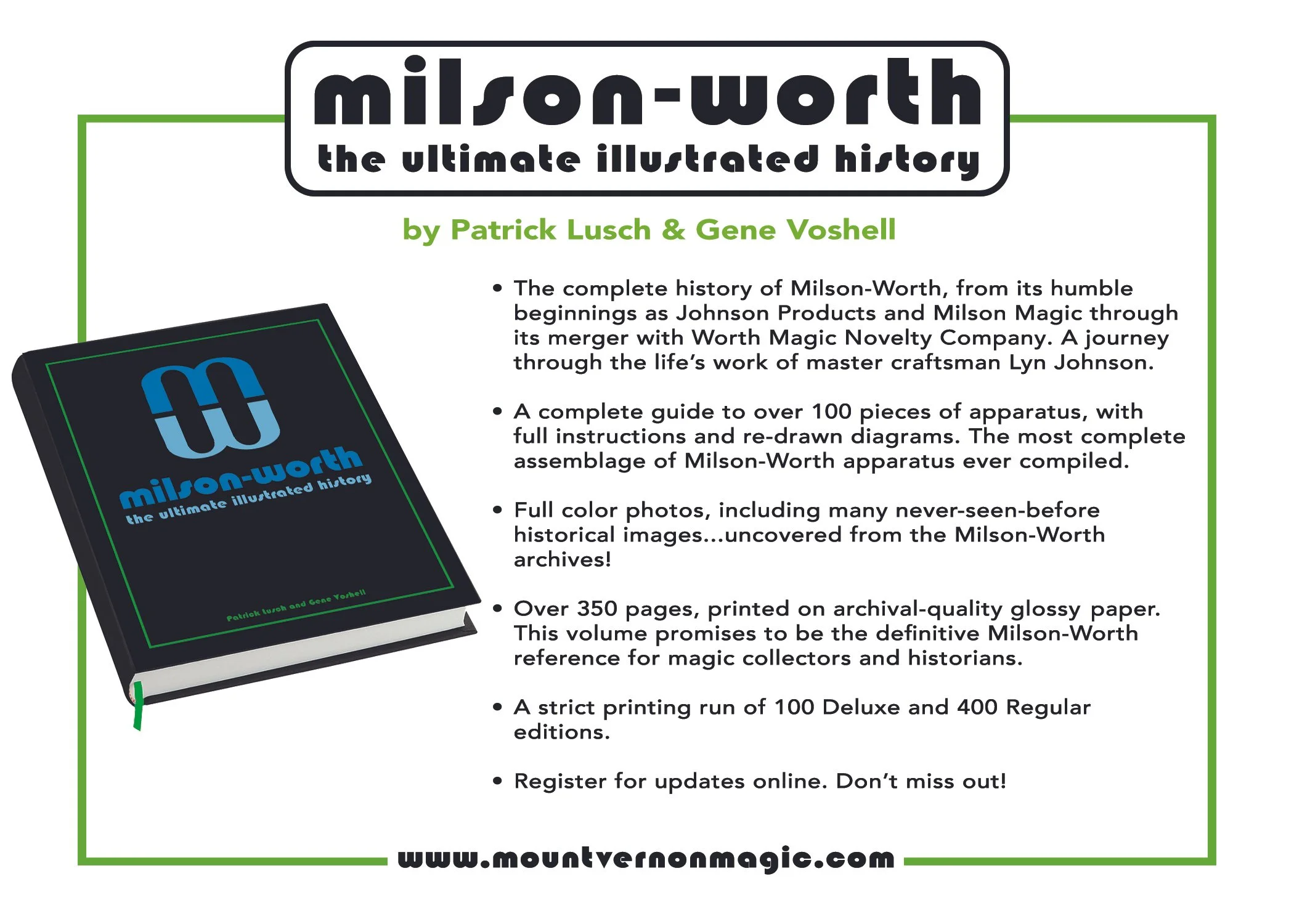 Authored by Patrick Lusch and Gene Voshell, the book is produced from many onsite visits and interviews with Lyn Johnson, Mike Caveney, and many others affiliated with this iconic brand. This color book is full of beautiful photography of Worth, Milson-Worth, and Johnson Products apparatus. Heavy research has been done to include a description, photos, and original instructions and routining for every effect produced by Worth and Milson-Worth. You won’t find a more complete Bible on Milson-Worth…anywhere!