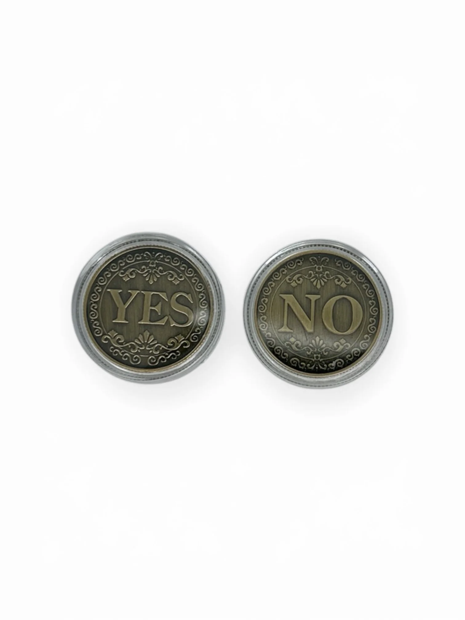 A bronze colored coin with yes, on one side and no on the other. Use this for a prediction effect, manipulation, palming, or anything else your imagination desires! Sold individually.