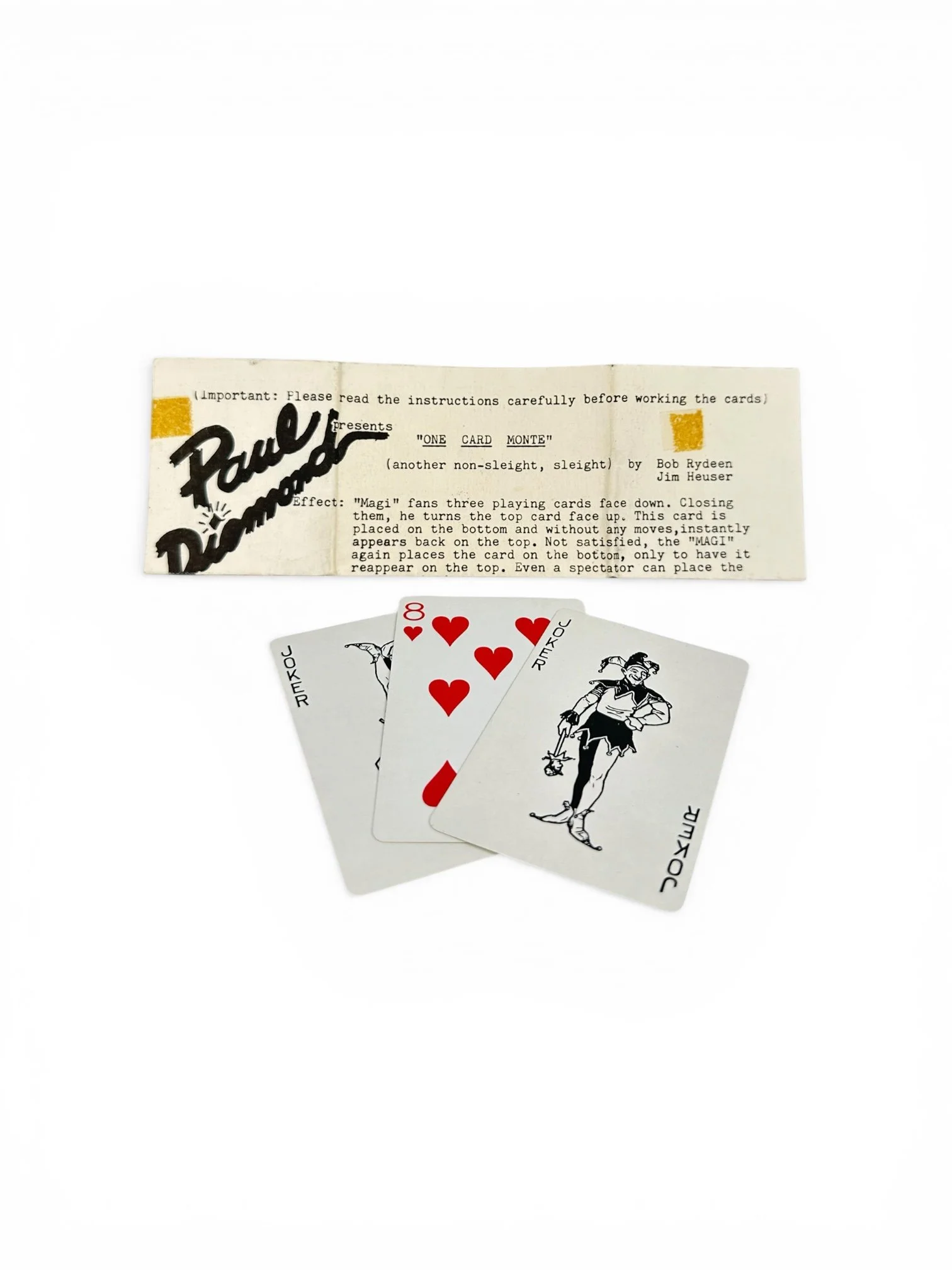 "Magi" fans three playing cards face down. Closing them, he turns the top card face up. This card is placed on the bottom and without any moves, instantly appears back on the top. Not satisfied, the "Magi" again places the card on the bottom, only to have it reappear on the top. Even a spectator can place the card on the bottom.