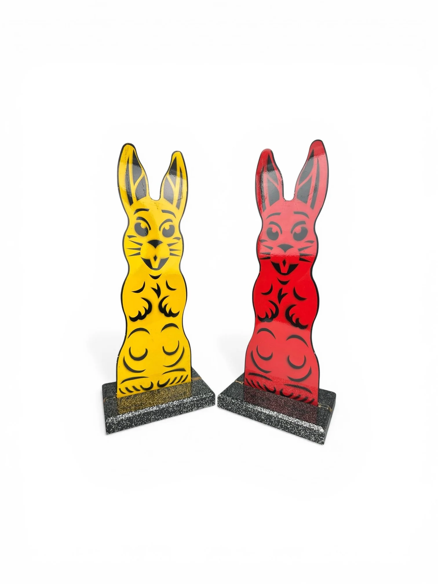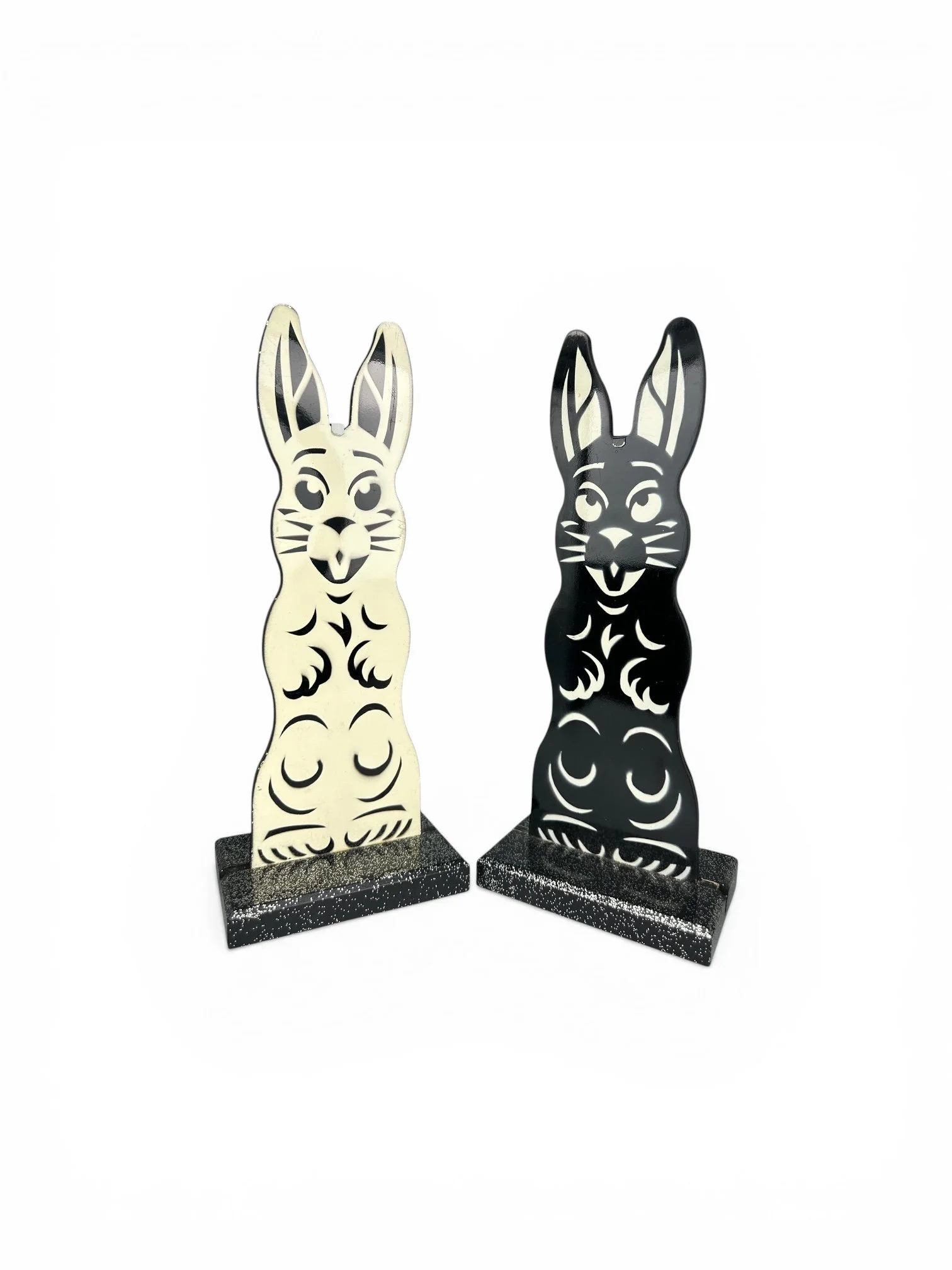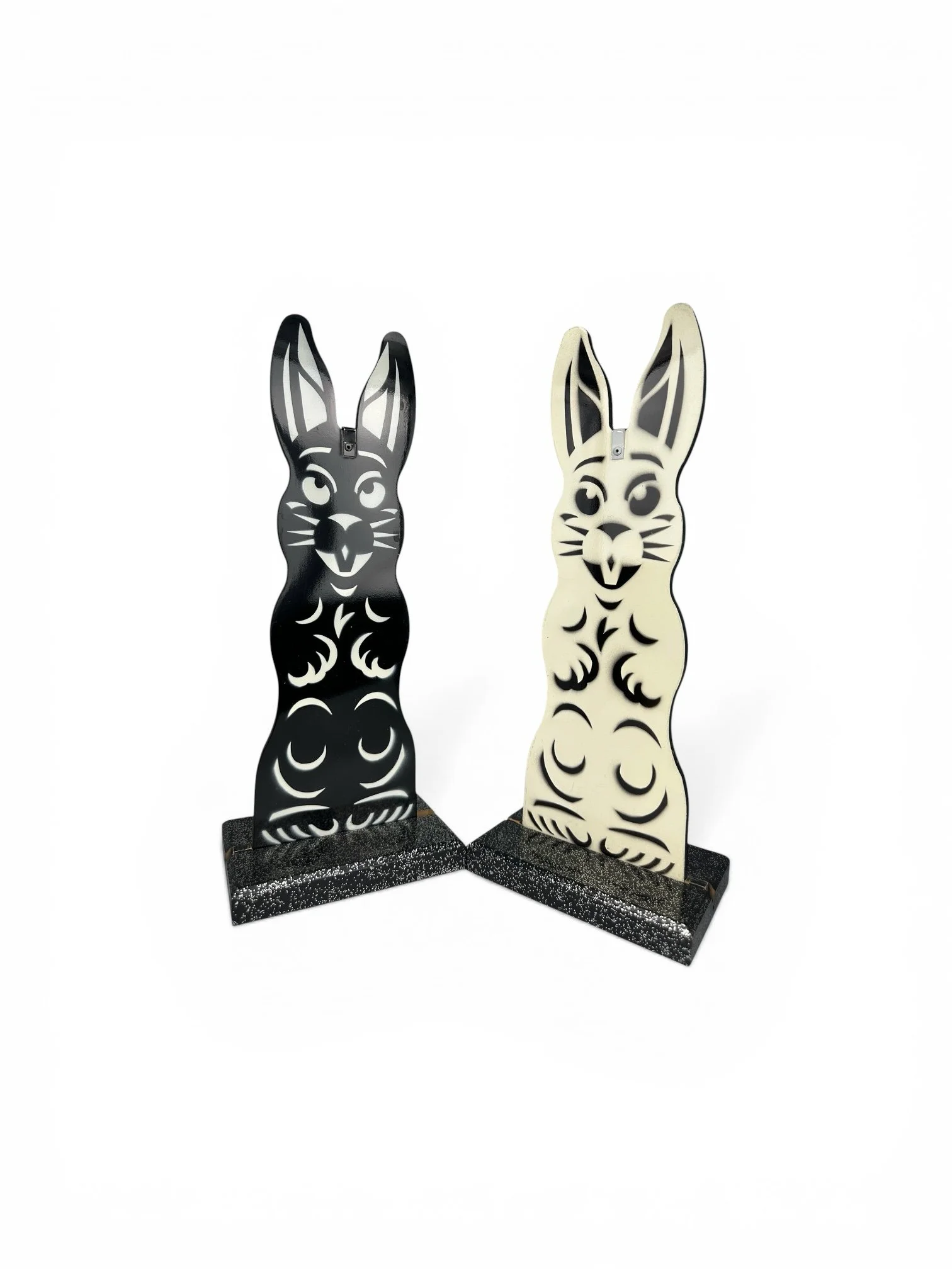 This beautiful outfit consists of two large wood cut-out rabbits, one white and the other black, and two metal covers. The rabbits change places, back and forth, several times. The audience thinks they know “how.” A real sucker climax is reached when the rabbits are turned around! Very well built of wood and masonite. Very good gently used condition.
