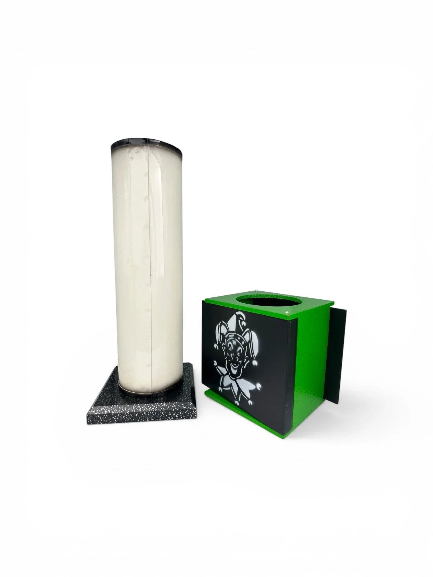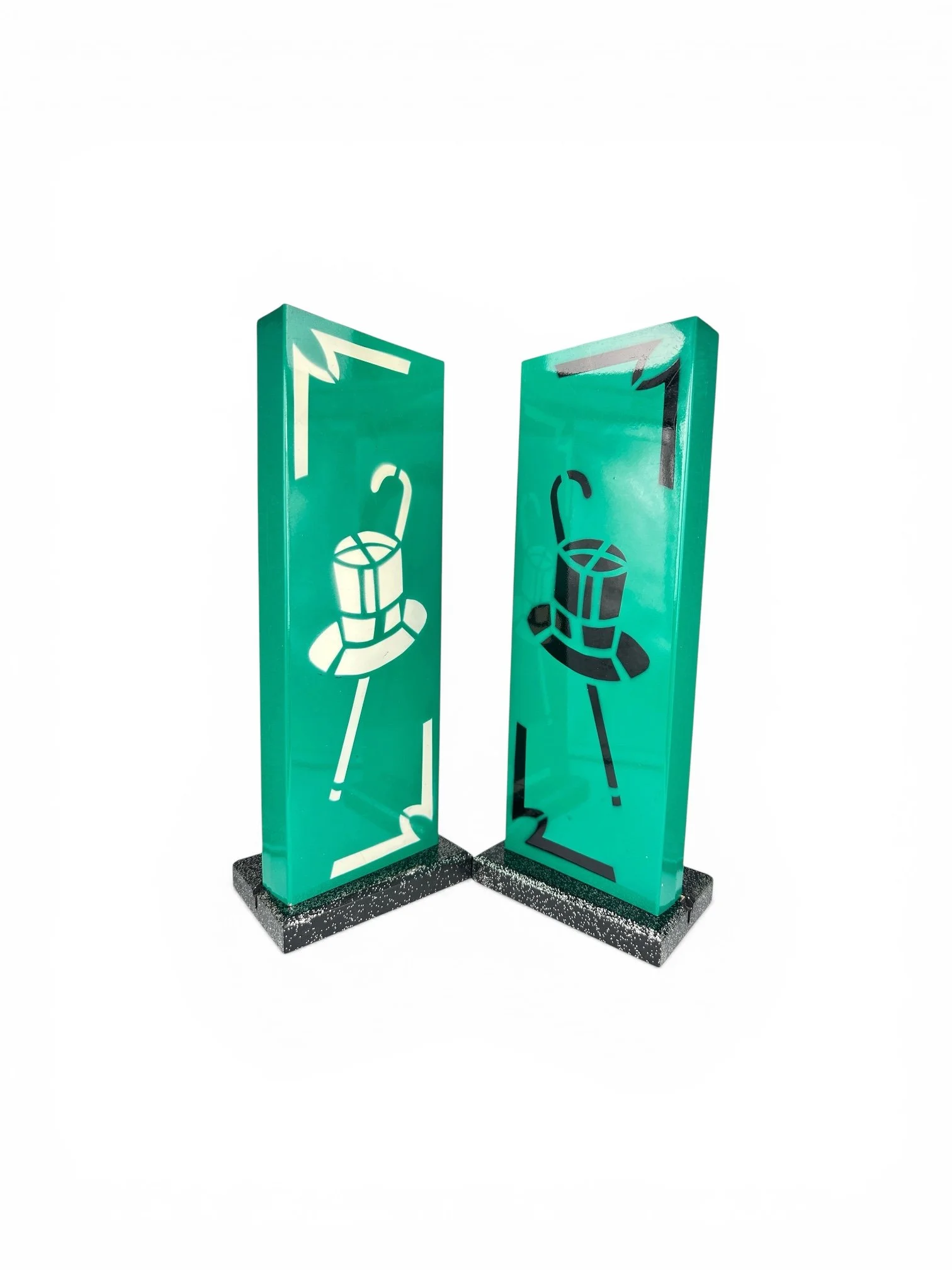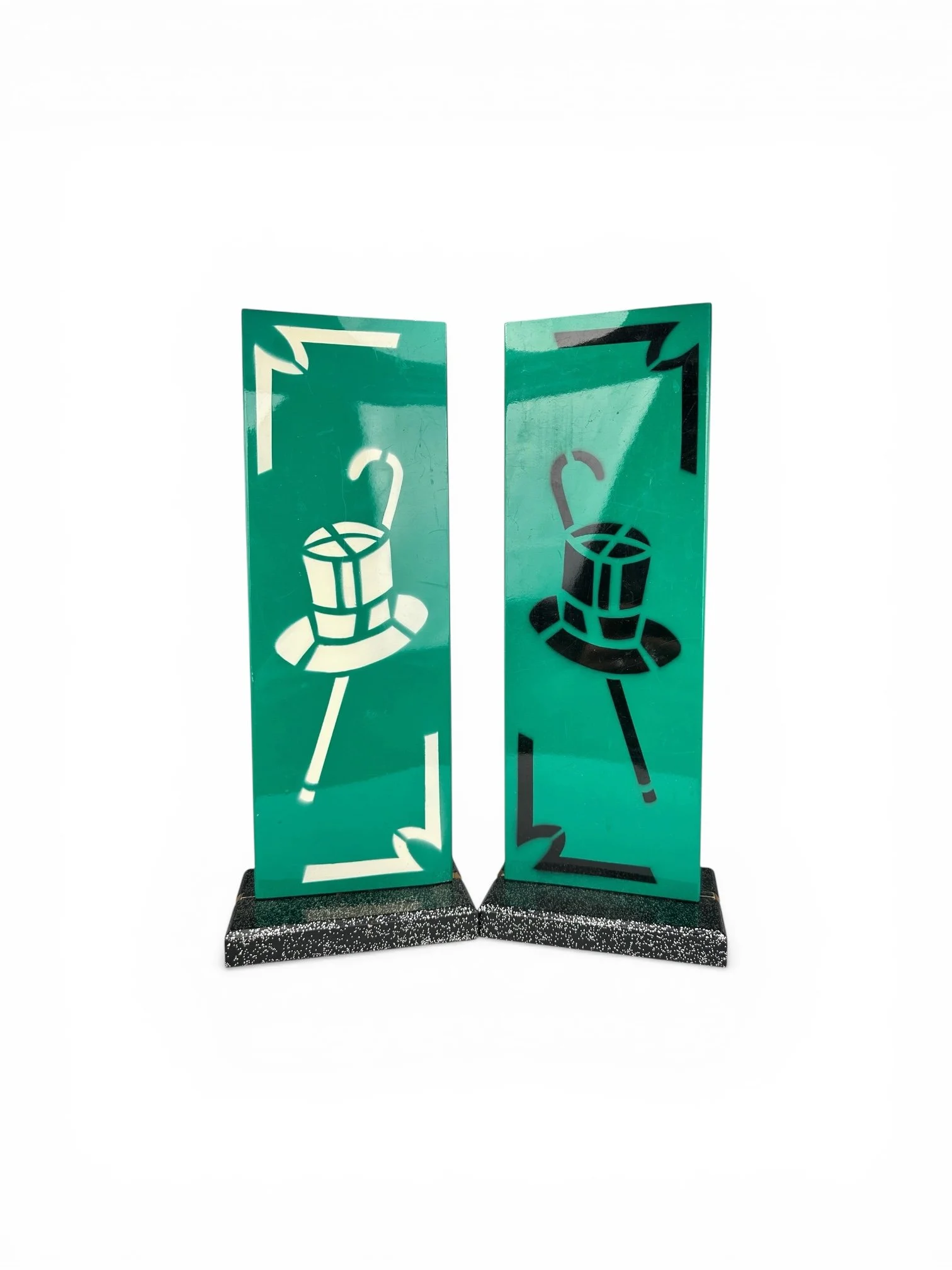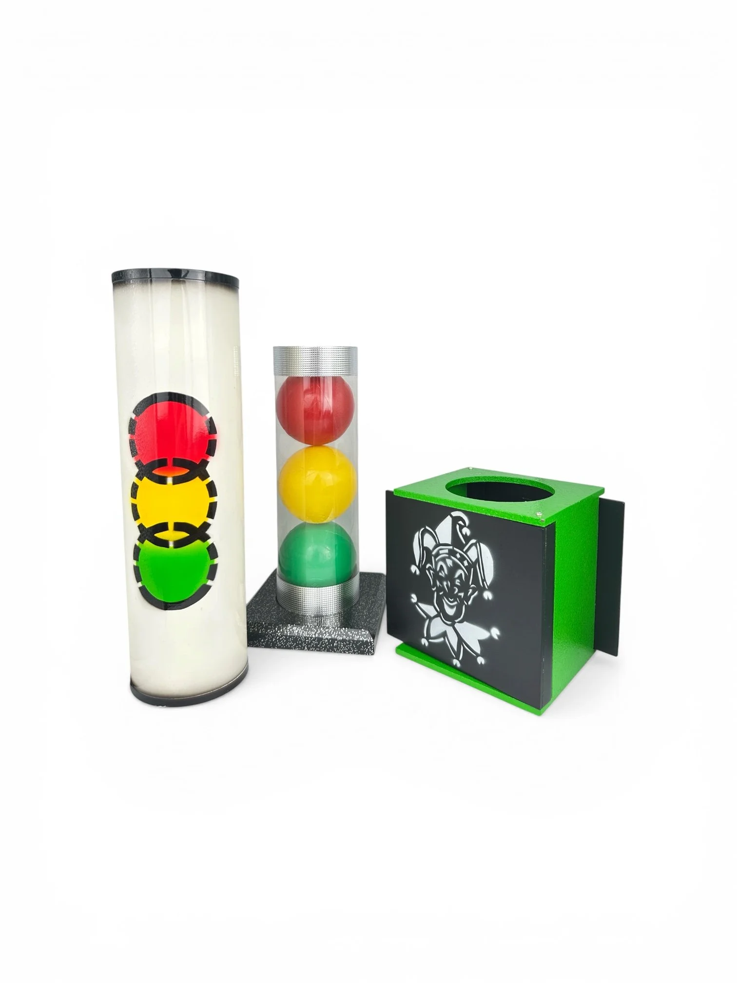 This beautiful outfit consists of two large wood cut-out rabbits, one white and the other black, and two metal covers. The rabbits change places, back and forth, several times. The audience thinks they know “how.” A real sucker climax is reached when the rabbits are turned around! Very well built of wood and masonite. Very good gently used condition.