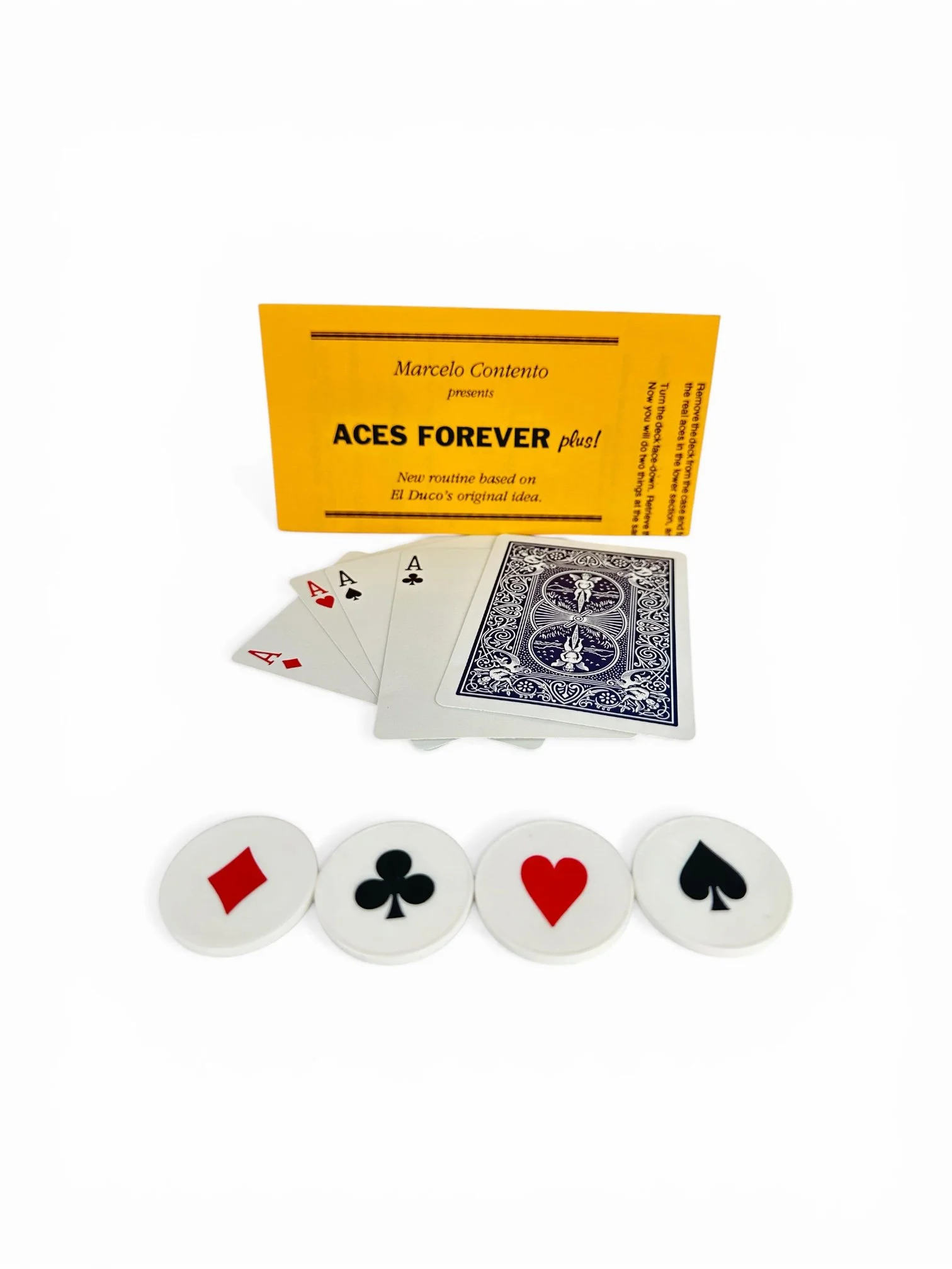 Marcelo Contento took an idea by El Duco to the next level. Performer shows four blank white poker chips. Then from a deck of cards you remove the four Aces and place them face down on the table, covering the chips. Magically, the suits of the Aces — Hearts, Clubs, Diamonds and Spades become imprinted on the chips! When the Aces are turned over, their suits have vanished. Complete with beautifully made poker chips, special cards and full routine. Brand new condition. Includes instructions and photograph routine.