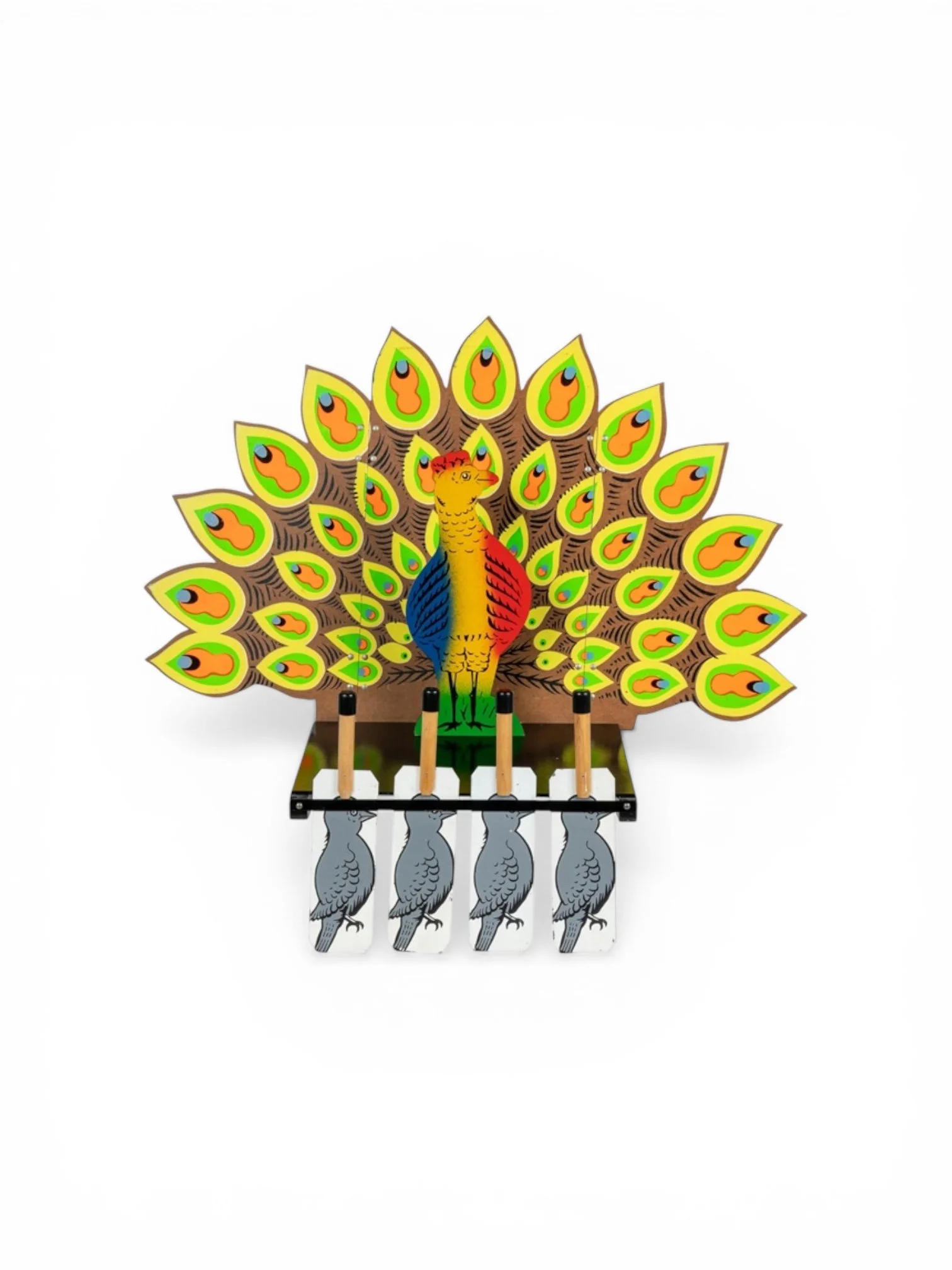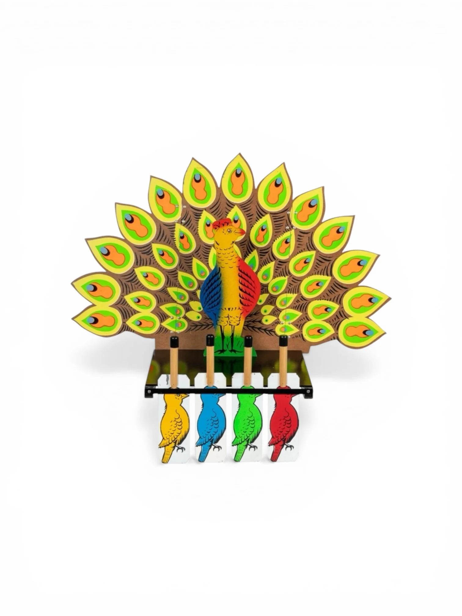 Circa 1967. Four small grey birds on paddles change colors, then the large bird on the stand behind them changes into a peacock with its bright and colorful tail feathers spread wide. Includes accessories and instructions. Very good condition!. 24 x 16” when opened.