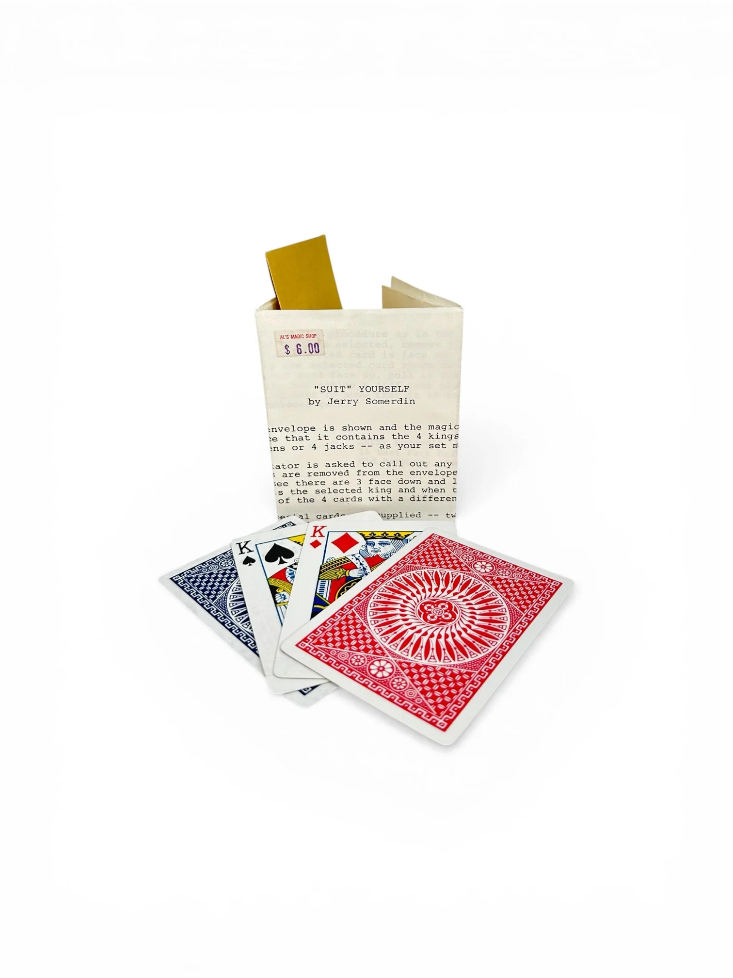 A pay envelope is shown and the magician tells the audience that it contains the 4 kings, all different suits (or 4 queens or 4 jacks -- as your set may contain).
